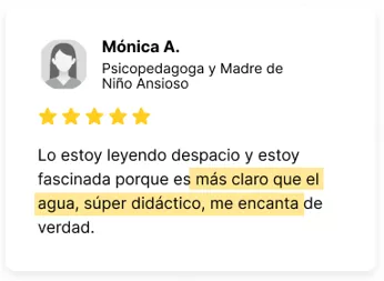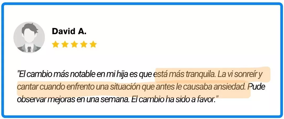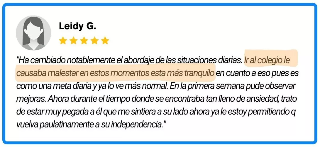 *Sus resultados dependerán de su nivel de dedicación, la situación individual de su hijo y otros factores externos. Los ejemplos presentados son solo para fines ilustrativos y no son una garantía de que usted o su hijo experimentarán los mismos resultados en la reducción de la ansiedad. La efectividad de las estrategias para manejar la ansiedad puede variar de un niño a otro.